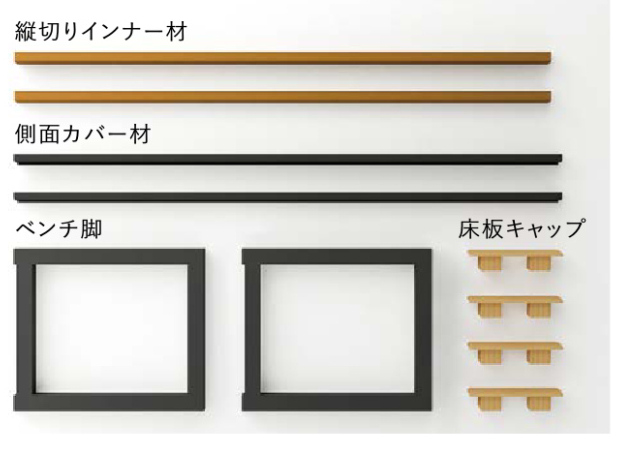 樹ら楽ステージと同じ5色のデッキ材を使えるのが最大の特長で、新しくデッキを設置する方はもちろん、すでにデッキがある方も、余った床材を有効活用してDIYを楽しめます!ベンチの脚など4つの部品部材を購入するだけで、デッキと統一感のあるベンチが完成。お庭での時間が、さらに充実したものになります!