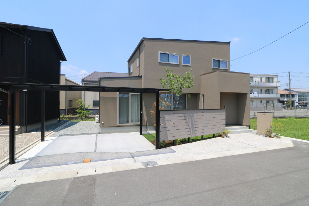 総社市|グレージュの外壁を引き立てる植栽とエコモックフェンス